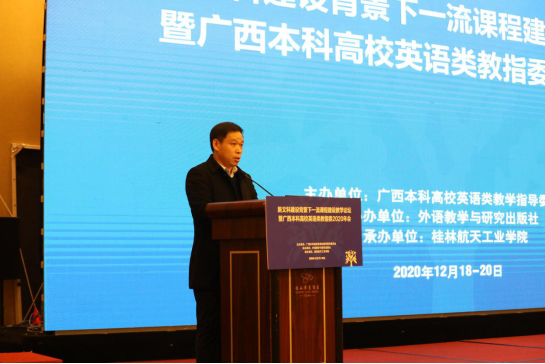 2020年12月19日,新文科建设背景下一流课程建设教学论坛暨广西本科高校英语类教指委2020年会在广西桂林桂山华星酒店成功举行。本次会议由广西本科高校英语类教学指导委员会主办,永利集团304am官方入口承办。学校孙山林副校长到会致辞,永利集团304am官方入口书记、院长唐琳主持开幕式。