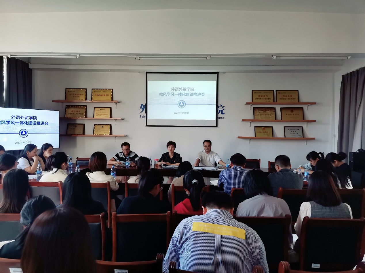 为全面落实立德树人根本任务,进一步巩固学风建设成果,持续推进教风学风一体化建设,提升我院教学质量和育人实效,10月13日下午,我院召开教风学风一体化建设工作推进会。我院党委书记唐琳、党委副书记张景新、教学副院长阳正义、2021级和2022级辅导员、班主任以及商务英语与国际商务两个专业的英语类综合课程及听说读写课程教师参会。会议由学院党委副书记张景新主持。
