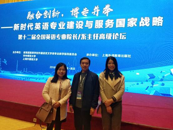 3月23日,由教育部高等学校外国语言文学类专业教学指导委员会、华中师范大学和上海外国语大学联合主办,上海外语教育出版社承办的第十二届“全国英语专业院长/系主任高级论坛”在武汉东湖宾馆会议中心举行,我院舒昌院长、商务英语教研室副主任黄兰堞老师和黄芳萍老师参加了本次会议。